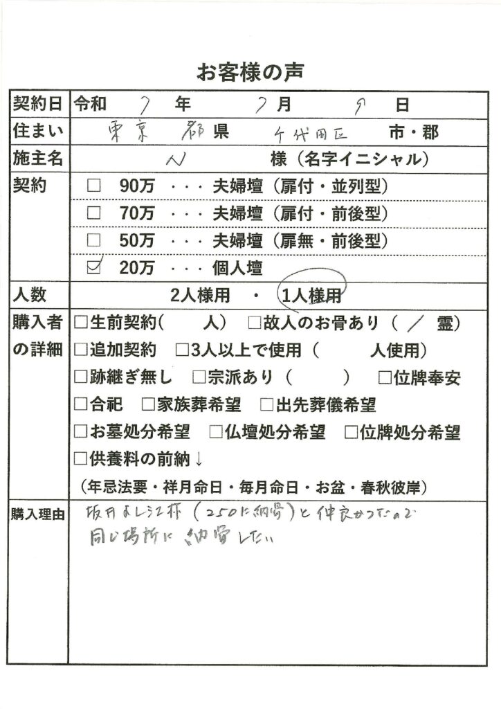 | 購入者の詳細 | 故人のお骨あり(1霊) |