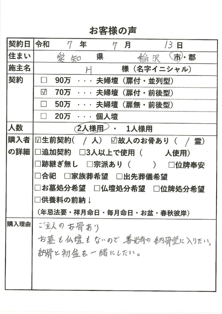 | 購入者の詳細 | 生前契約(1人)・故人のお骨あり(1霊) |