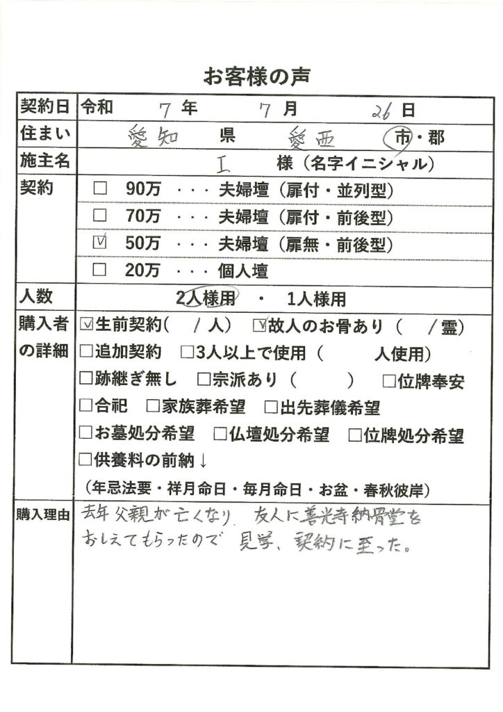 | 購入者の詳細 | 生前契約(1人)・故人のお骨あり(1霊) |