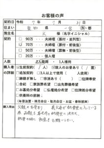 | 購入者の詳細 | 生前契約(1人)、故人のお骨あり(1霊) |