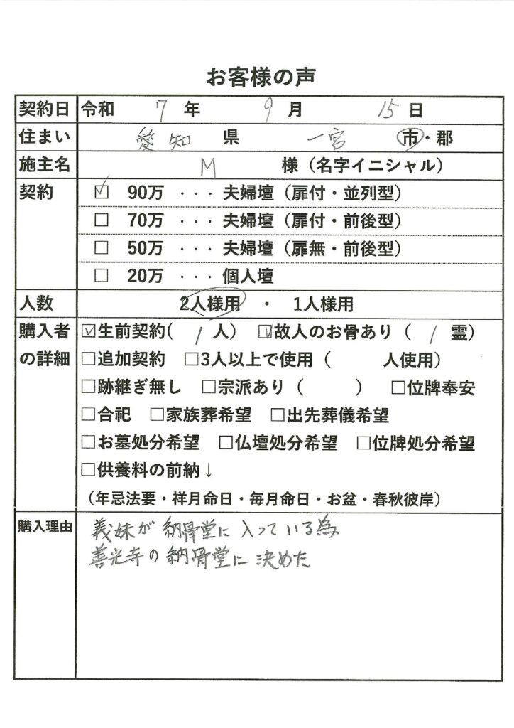 購入者の詳細生前契約(1)、故人のお骨あり(1霊)
