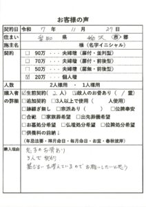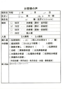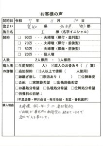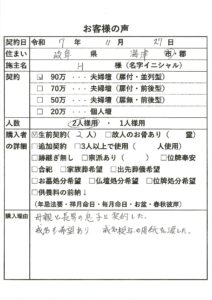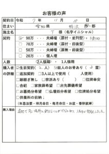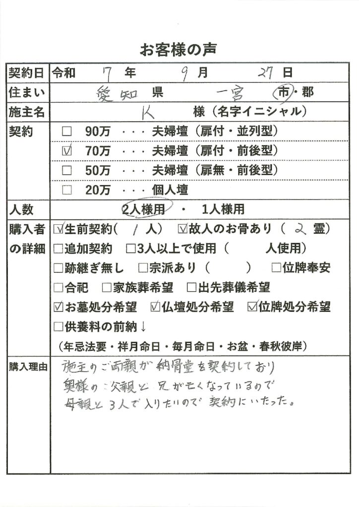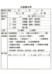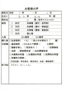 | 購入者の詳細 | 生前契約(1)、故人のお骨あり(2霊)、お墓処分希望、仏壇処分希望、位牌処分希望 |