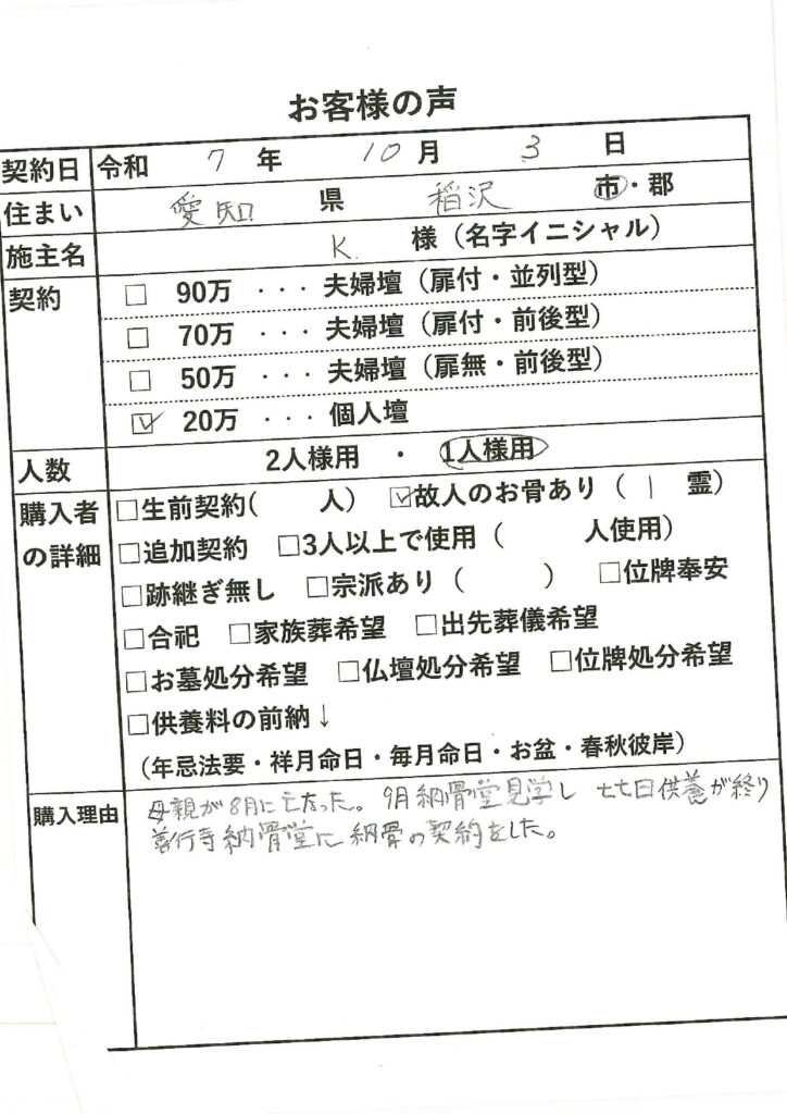 | 購入者の詳細 | 故人のお骨あり(1霊) |