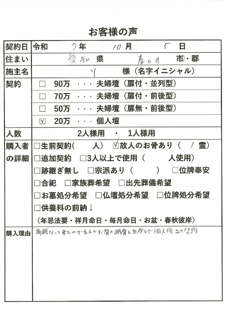 | 購入者の詳細 | 故人のお骨あり(1霊) |