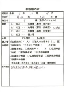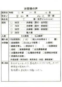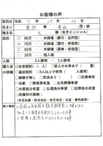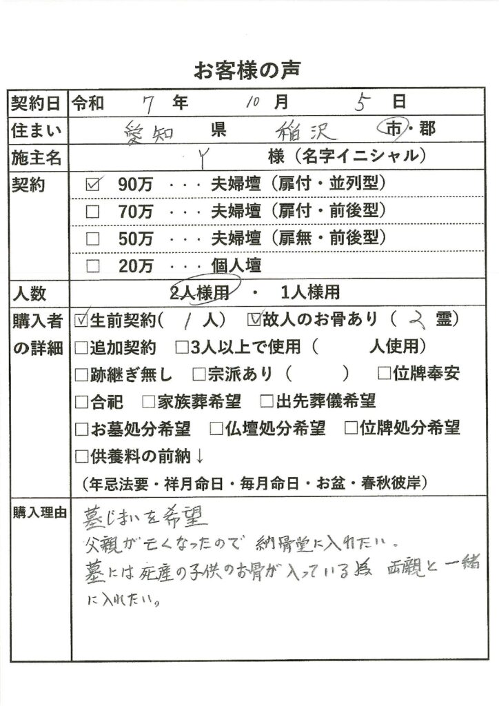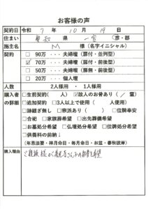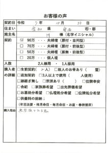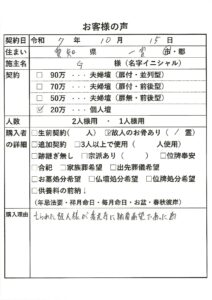 | 購入者の詳細 | 生前契約(1)、故人のお骨あり(2霊) |