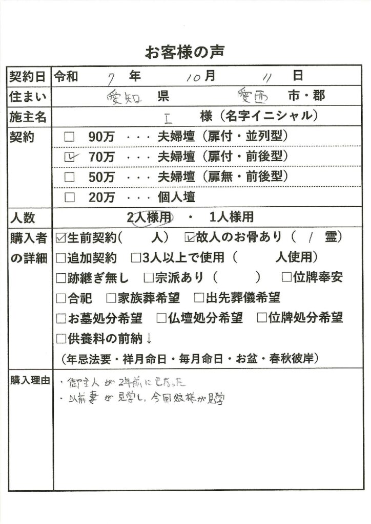 | 購入者の詳細 | 生前契約、故人のお骨あり(1霊) |