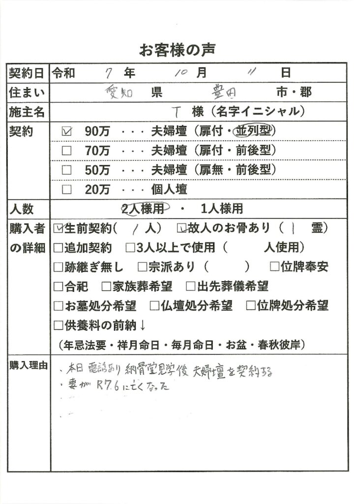 | 購入者の詳細 | 生前契約(1)、故人のお骨あり(1霊) |