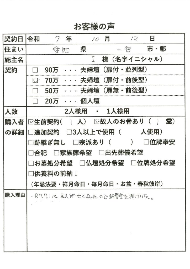 | 購入者の詳細 | 生前契約(1)、故人のお骨あり(1霊) |