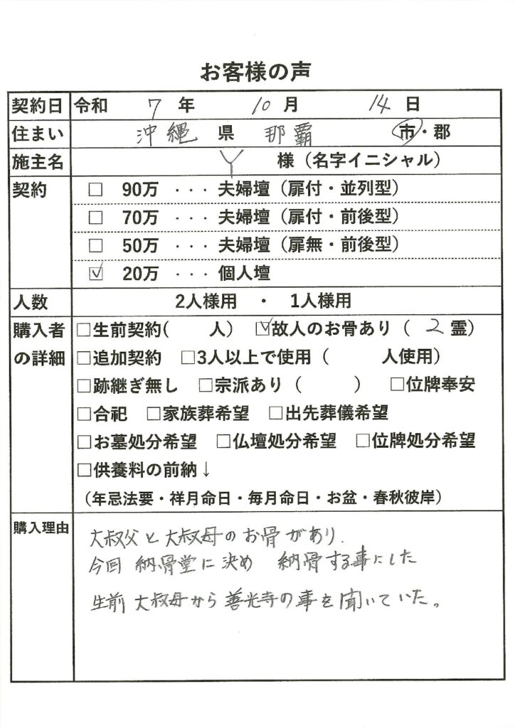 | 購入者の詳細 | 故人のお骨あり(2霊) |