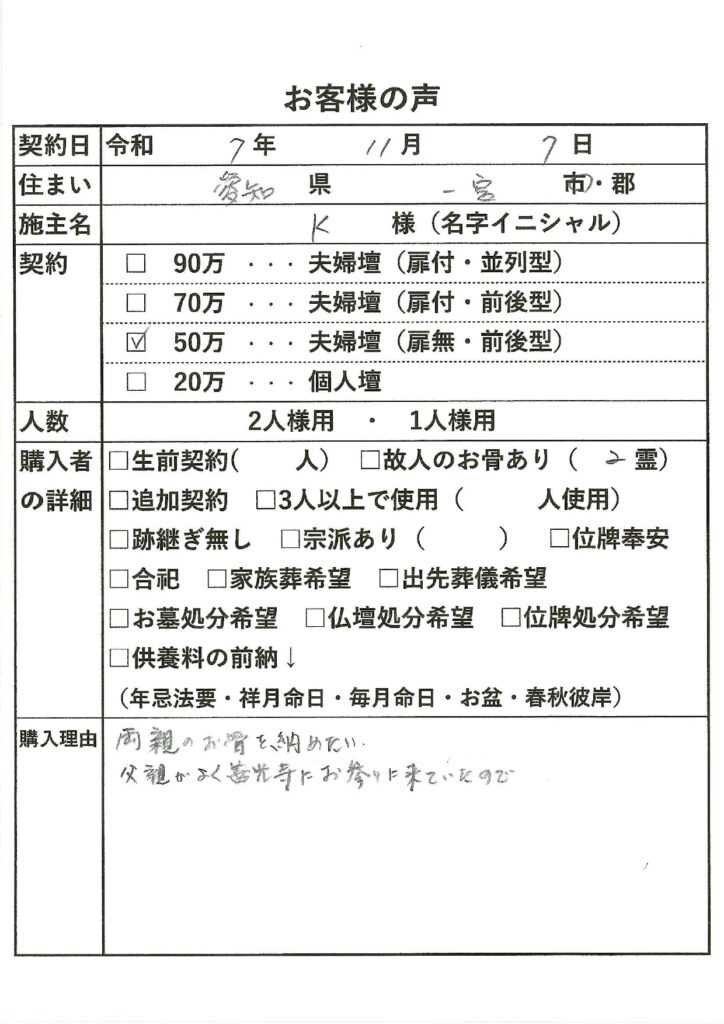 | 購入者の詳細 | 故人のお骨あり(2霊) |