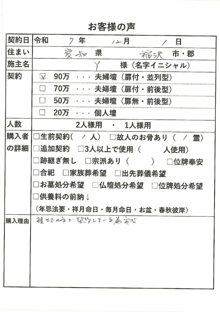 | 購入者の詳細 | 生前契約(1)、故人のお骨あり(1霊) |