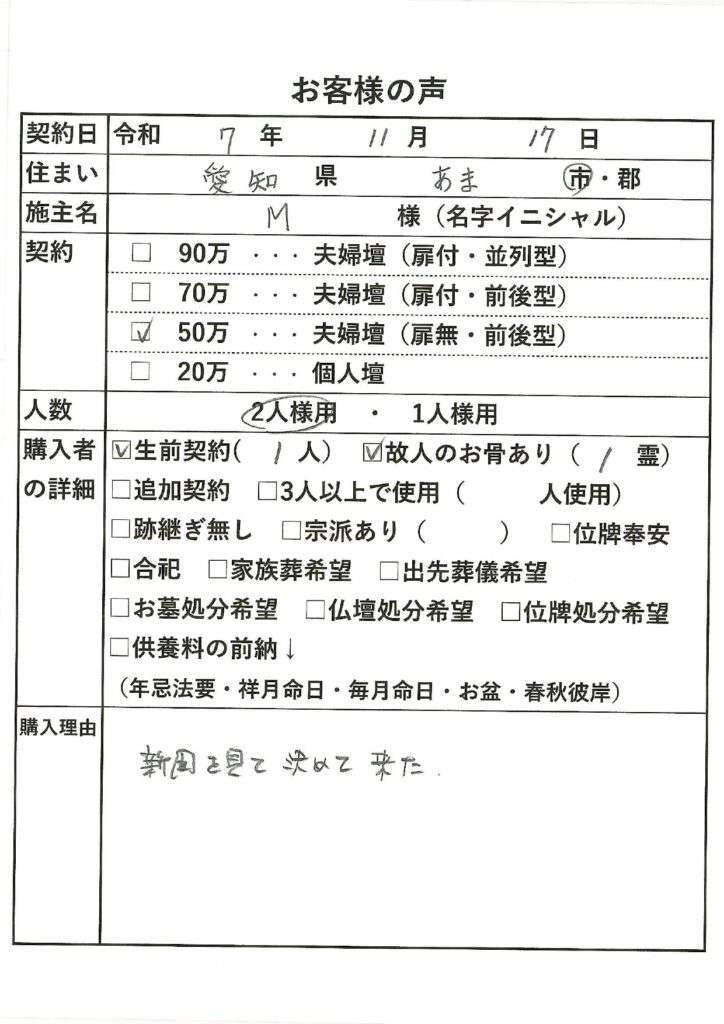 購入者の詳細生前契約(1)、故人のお骨あり(1霊)
